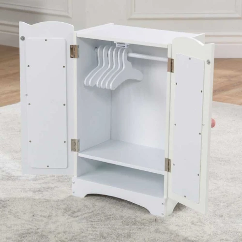 The KidKraft Lil’ Doll Armoire is a fun and elegant way for kids to keep their doll clothes organized. It’s the perfect size for 18-inch dolls, with classic scalloped edges and six wooden hangers, this is a pretty addition to a doll’s room. The twin mirrors are made with safe and sturdy plastic and the wood construction means this little armoire will last for years.