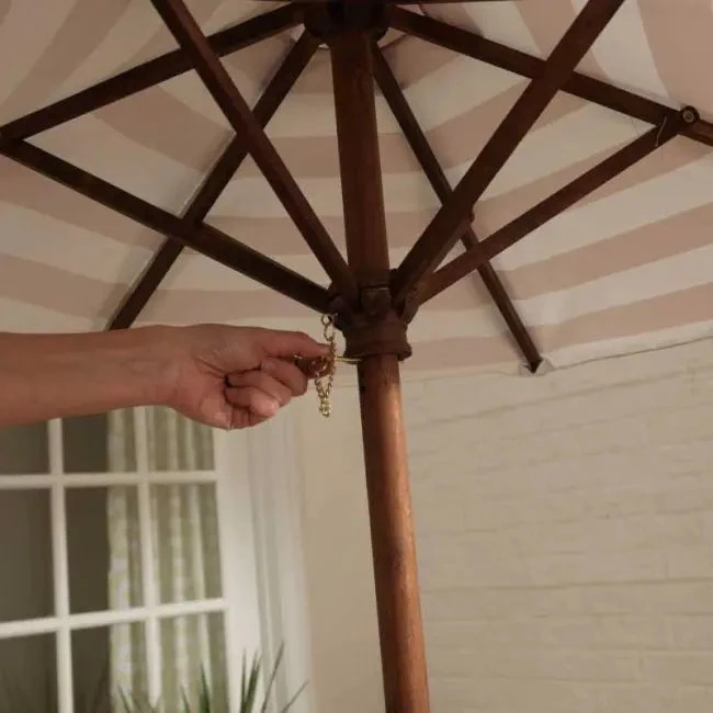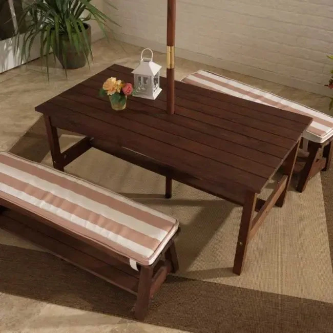 - Sturdy table with two benches and folding umbrella