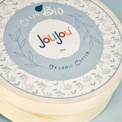 Bleuette is made of organic cotton, it is stuffed with 100% recycled polyester fibres. She wears a blue jersey t-shirt and blue plant-patterned swaddle bloomers, delicately matching her little bow. His Doudou attached to the hand is in cotton velvet on the front, and in linen on the back.