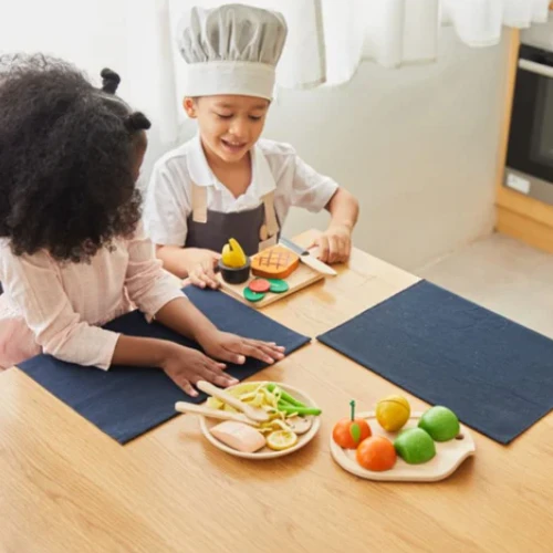 It’s important to teach children the benefits of a well-balanced meal. With this set, children can prepare a western-style steak for themselves or a guest. This set includes 1 halved tomato, 3 potato wedges, 2 slices of lettuce, 1 sauce cup, 1 knife, 1 slab of sliceable beef, and 1 cutting board. Encourage a young chef to develop an extensive menu by combining this set with other PlanToys pretend foods and kitchenware.