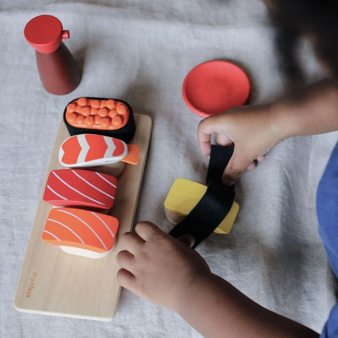 This Sushi Set includes salmon roe made from PlanWood, tamago, shrimp with a rubber tail, tuna and salmon, and a sheet of seaweed that can be wrapped around the pieces of rice for a realistic feature! Your little sushi chef will enjoy making and serving the sushi with the included sushi tray, shoyu bottle and sauce dish.