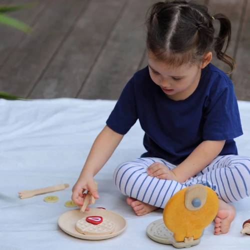 REALISTIC DESIGN: The set includes a waffle maker, spoon, fork, knife, pair of tongs, fruit toppings and syrup so children can have a realistic play experience. Also, because this set is sustainably-manufactured and free from harmful substances, little ones can play safely and without a worry! SUPPORTS DEVELOPMENT: Fine motor skills, hand-eye coordination and concentration ability are all stimulated while pretend playing with the Waffle Set. Interactive play with others improves social and communication skills while role playing triggers the imagination. Suitable for children 3 years and older.